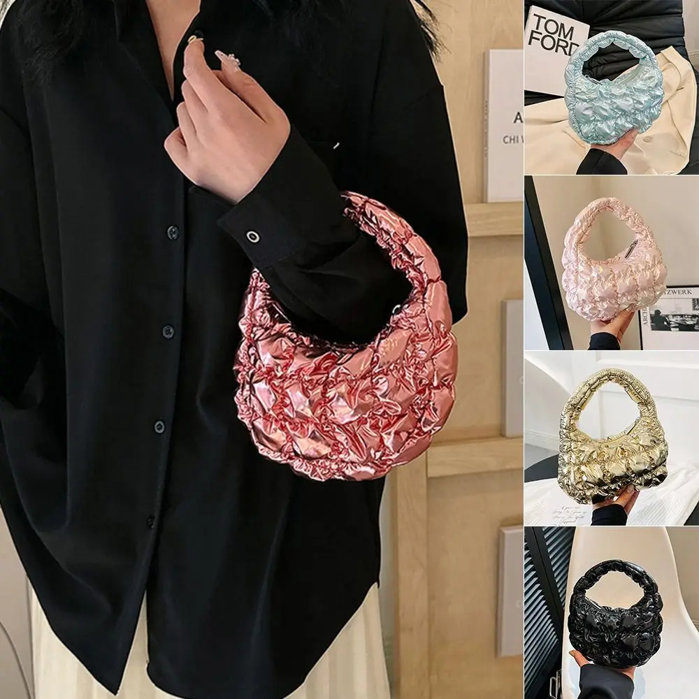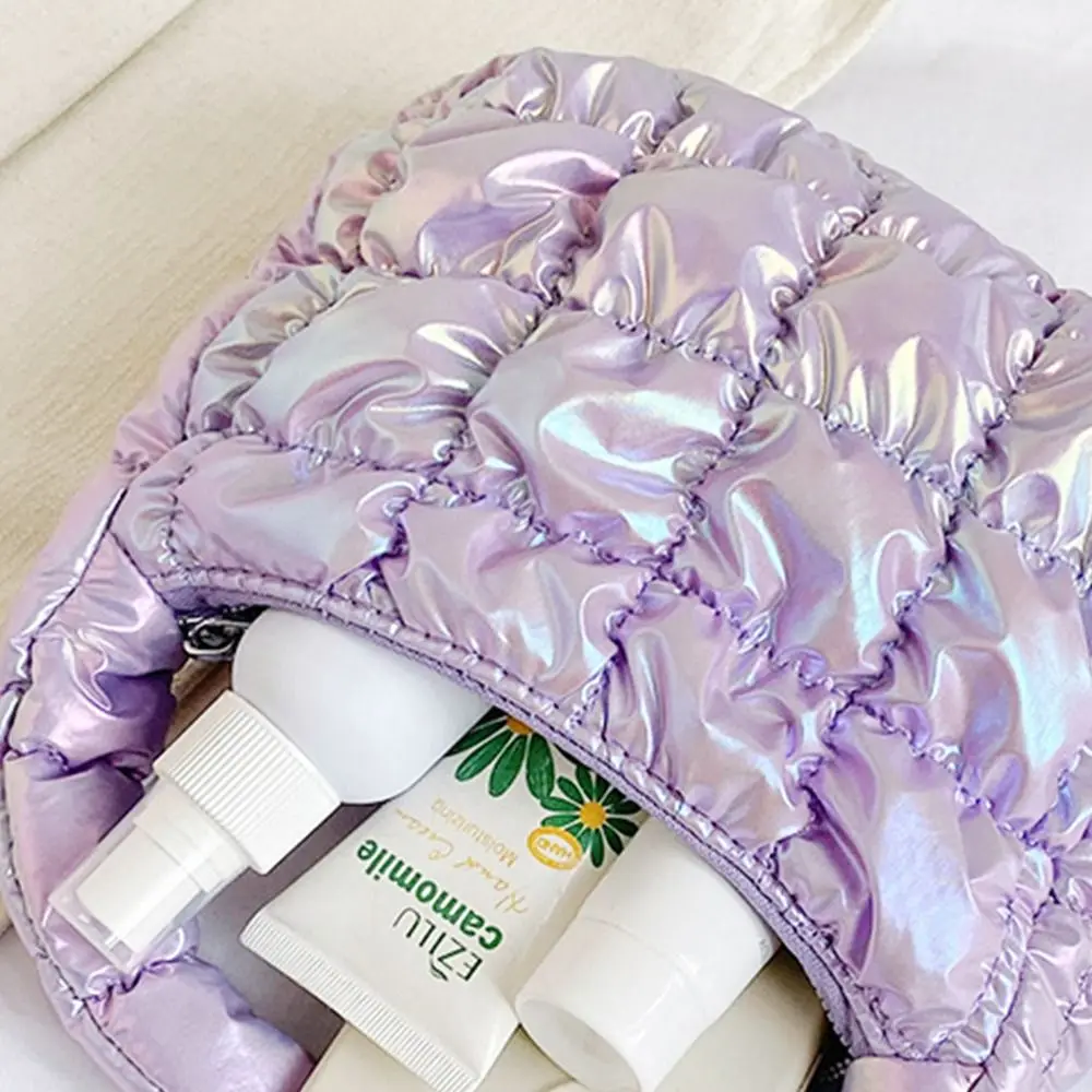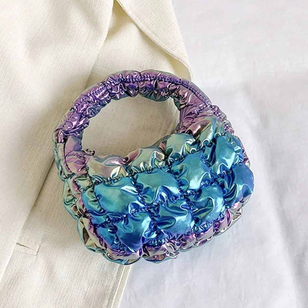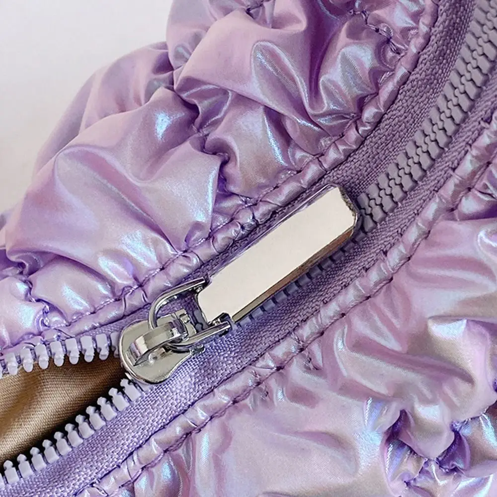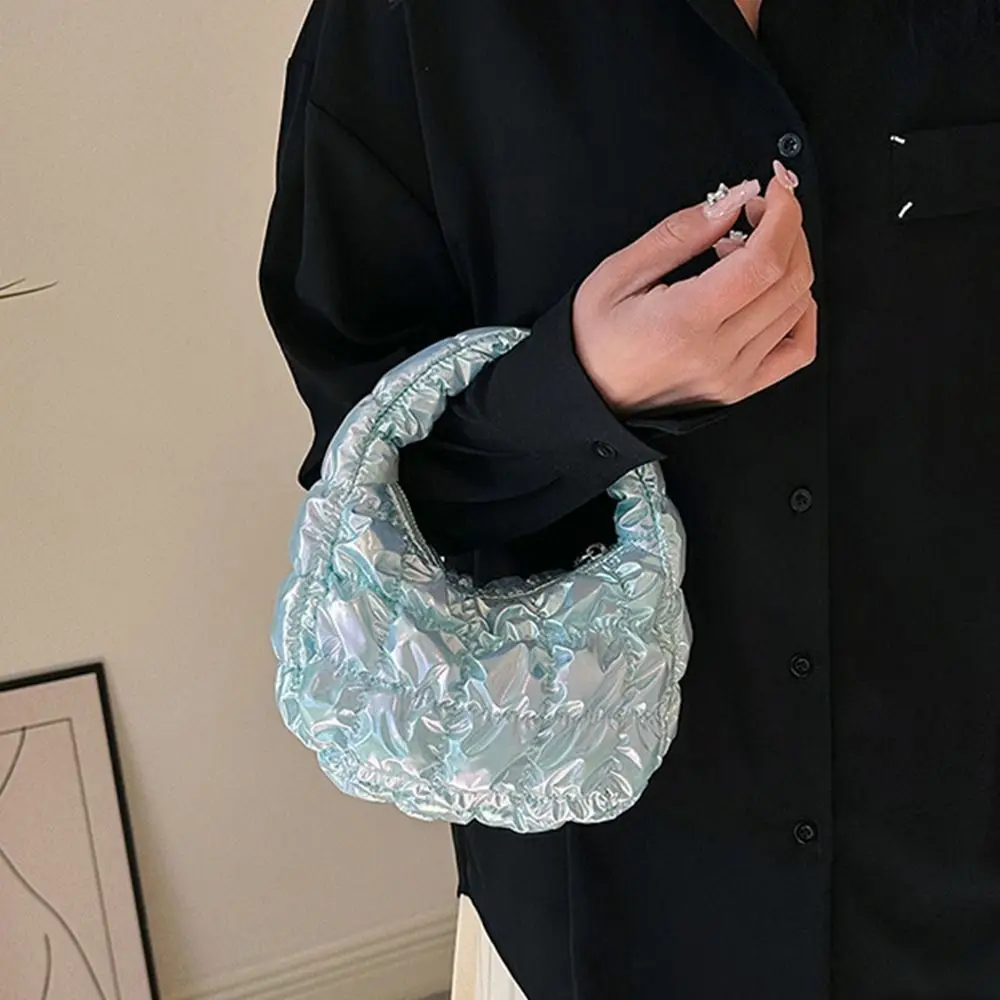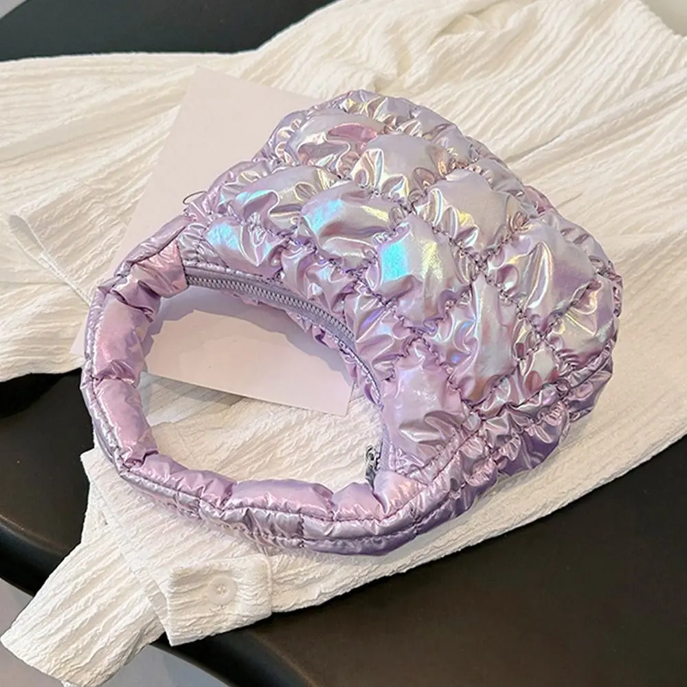Je pakt haar vast, voelt de zachte puffy structuur en ziet hoe het metallic oppervlak het licht vangt. Je kiest een simpele outfit. Zij doet de rest.